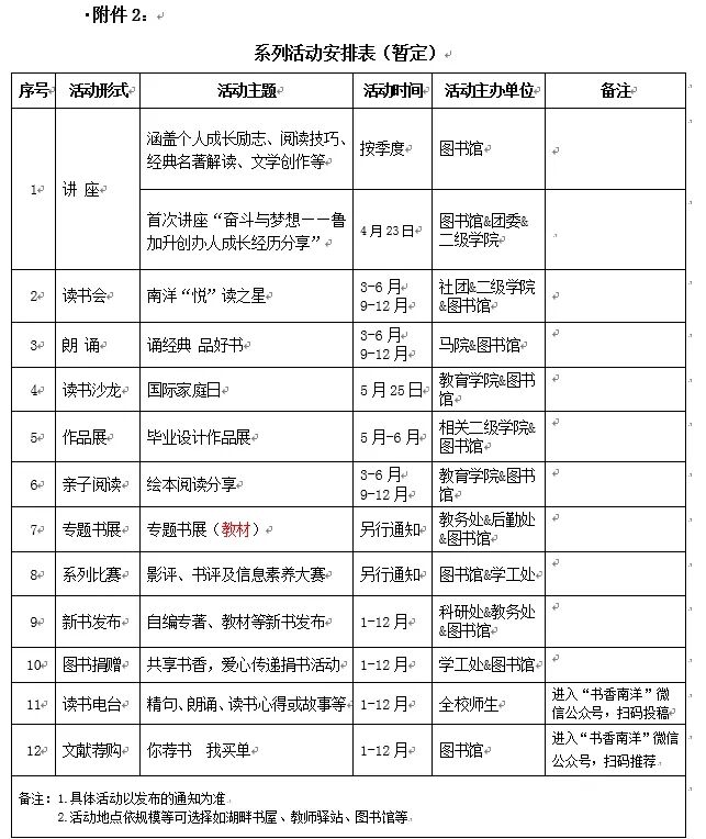 为营造浓厚的校园文化氛围,激发全校师生的阅读热情,提升师生的文化素养和综合素质,经研究决定,学校由图书馆牵头组织开展“书香南洋·阅读启智”系列活动。现将活动相关事宜通知如下: