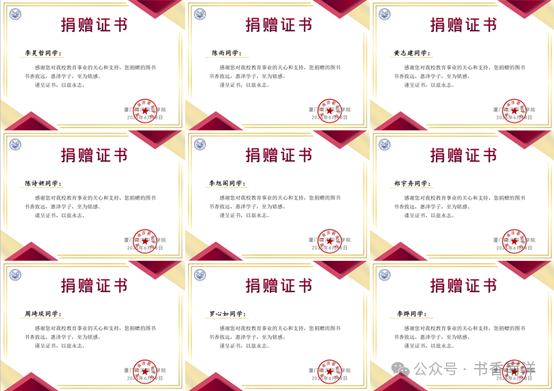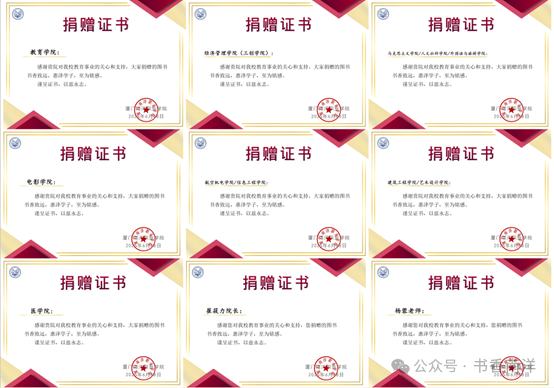 此次集中捐书倡议活动得到了全校各部门的积极响应和大力支持,以下是部分捐赠证书展示: