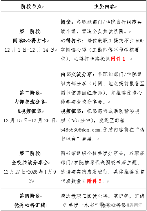 为积极响应学校“书香南洋・阅读启智”系列活动,进一步激发全体教师的深度阅读热情,凝聚教师情感、传承校园文化,促进教师间思想交流与碰撞,由图书馆牵头策划“共读一本书”活动。本活动以“共读促共鸣,交流启智慧”为核心,通过集体阅读、心得分享、深度研讨等形式,推动阅读从“个人行为”向“群体共创”延伸,营造浓厚的书香校园氛围。现制定如下实施方案: