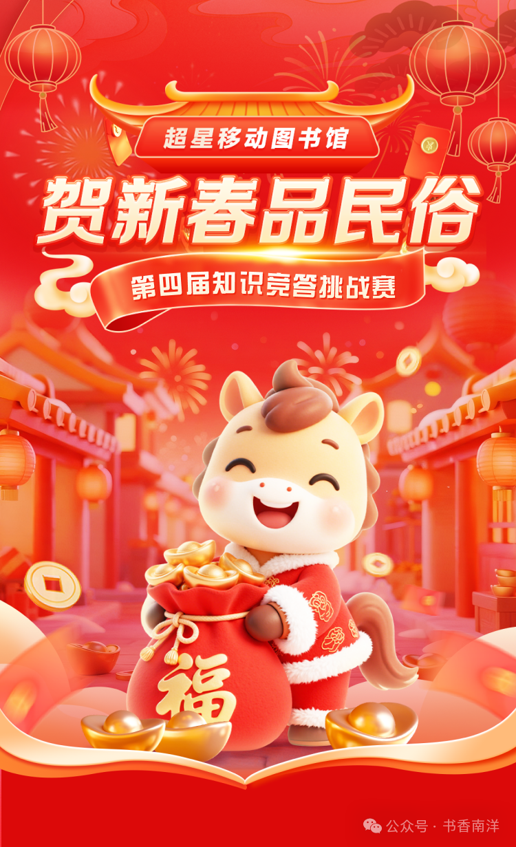 春节,中华民族最重要的传统佳节,蕴含深厚文化与历史。喜庆之际,除走亲访友、品尝美食,还可参加超星移动图书馆第四届知识竞答挑战赛,于答题闯关间领略春节独特魅力!